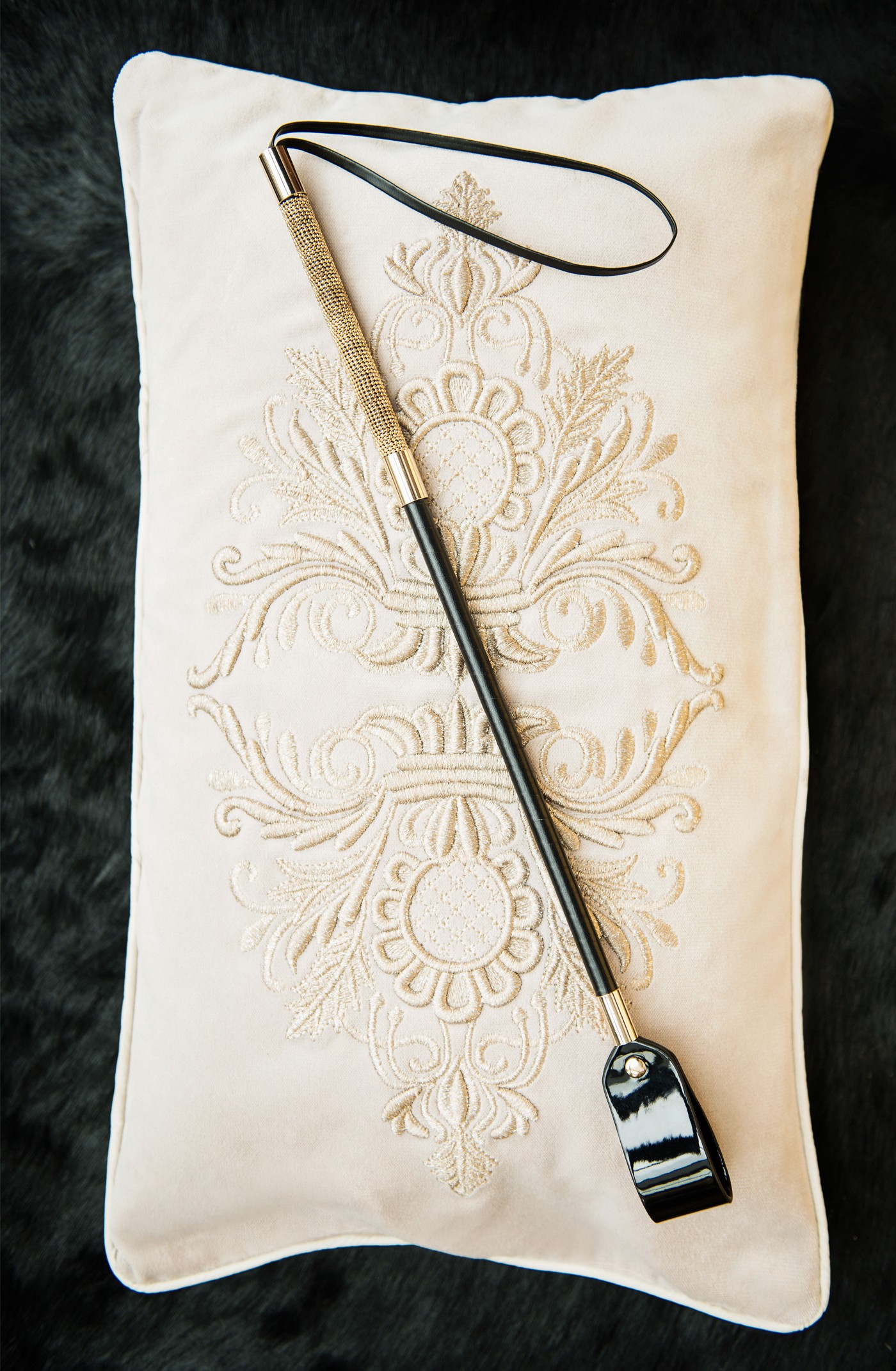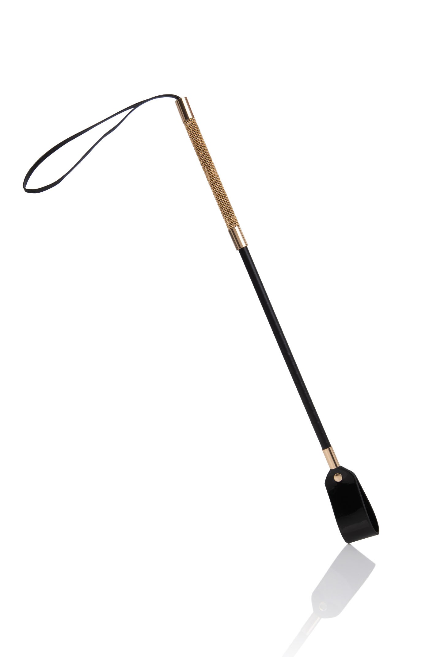 Uncover unique sensations with an elegant leather whip and golden detail.