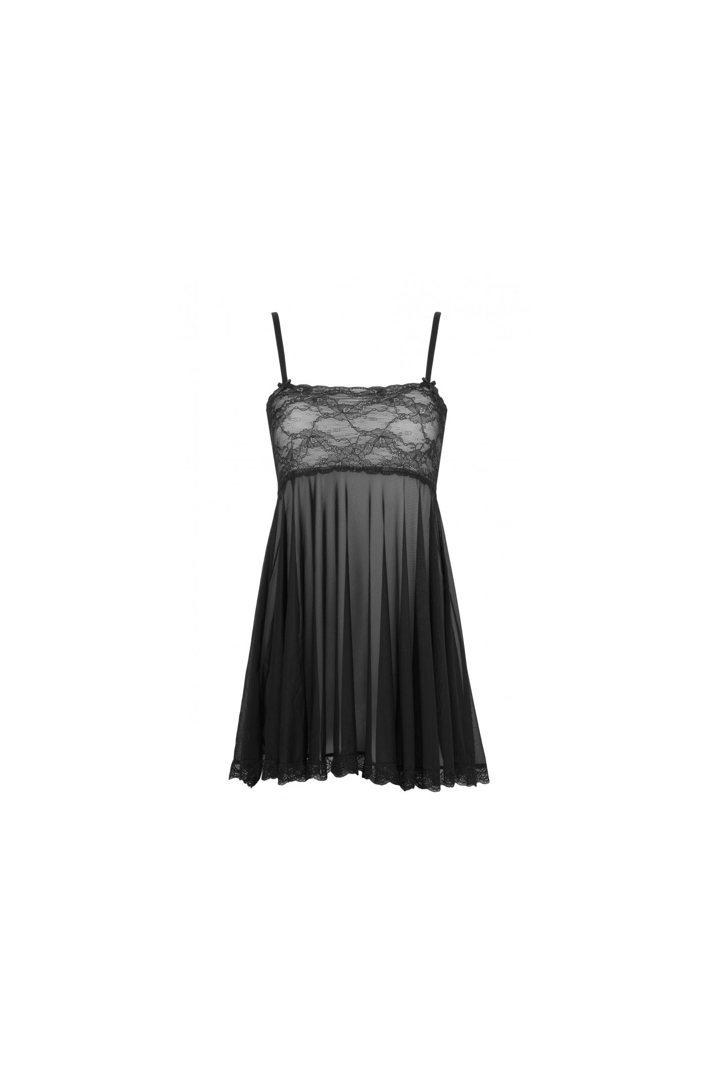 Nuisette en mousseline noire. Bande de dentelle à la poitrine et au bas de la nuisette. Bretelles réglables.