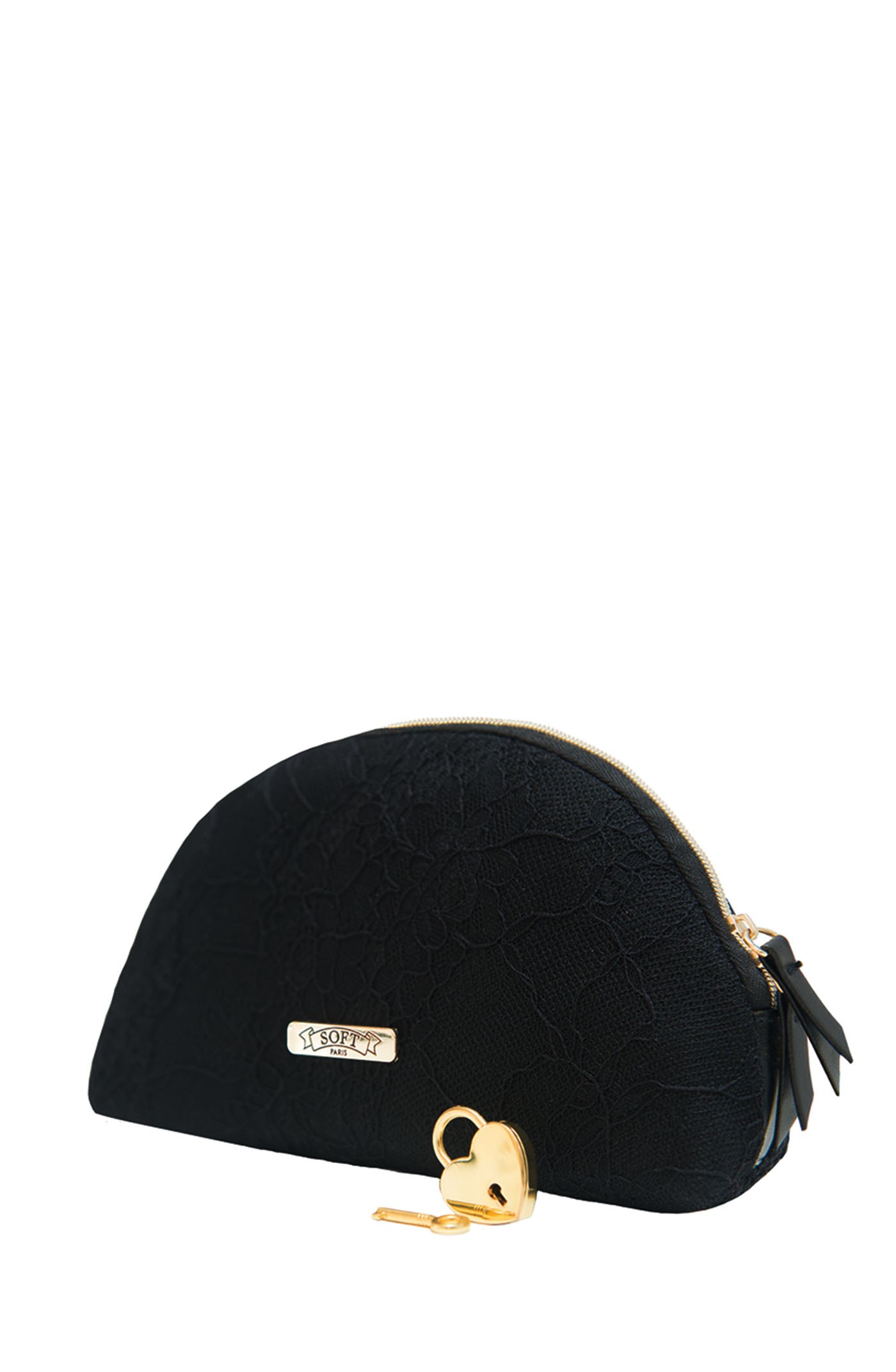 Materials: black lace on the outside and waterproof polyester on the inside. 1 golden zip, vegan leather details, golden tag, heart-shaped padlock and key. Dimensions: 8.3" x 2.4" x 4.3" Care instructions: Wipe clean with a damp cloth.