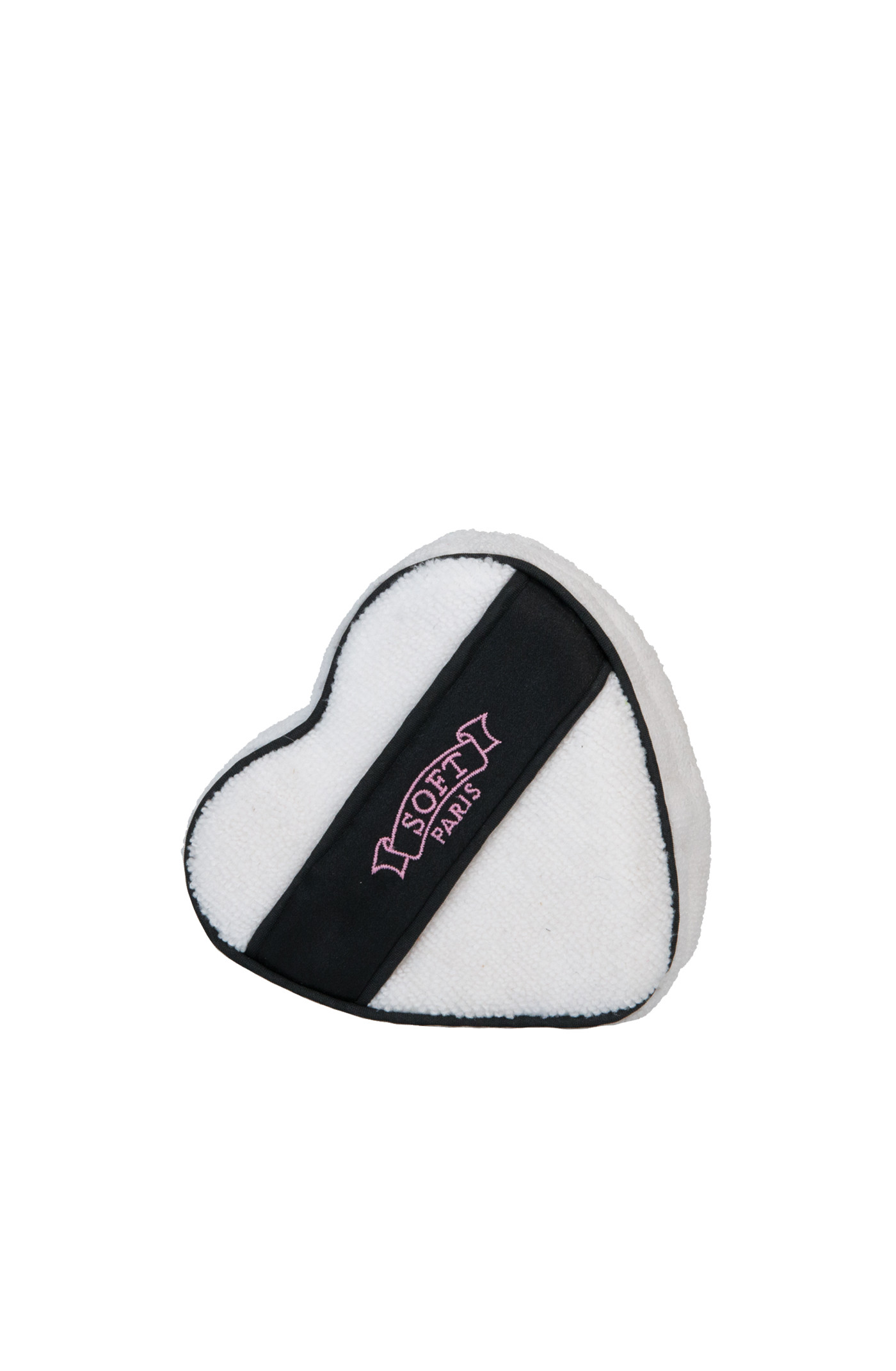 Heart-shaped, white, equipped with an invisible velcro opening, adorned with black satin trims and a black satin band embroidered with a pink Soft Paris logo.