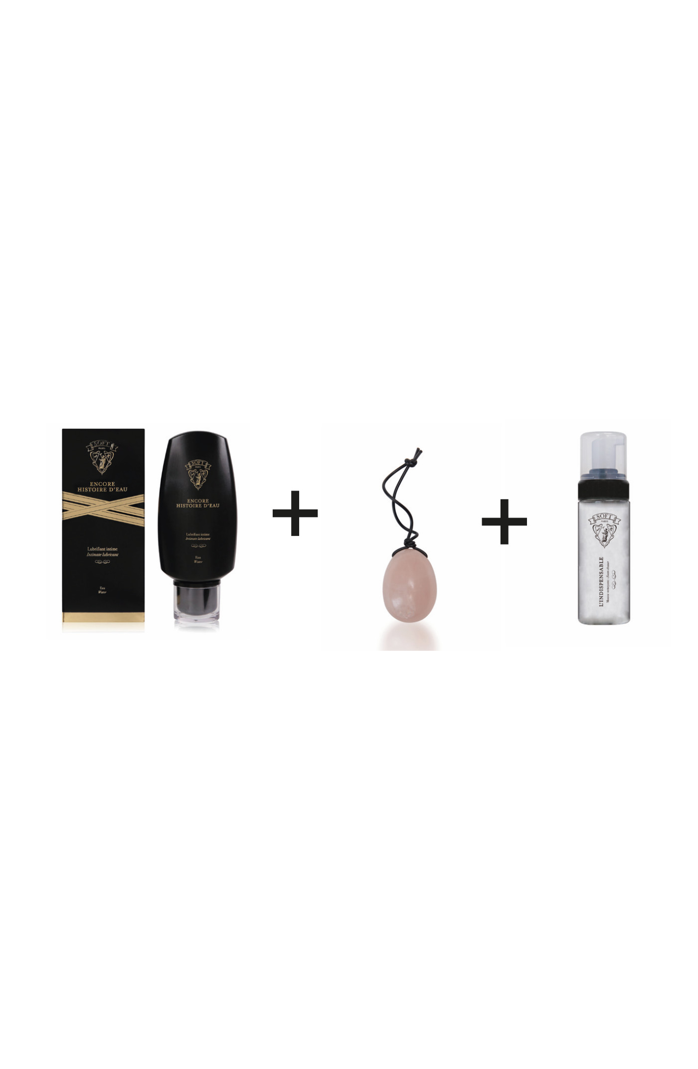 quartz rose), 1 Encore Histoire d’Eau (lubrifiant) et 1 Indispensable (mousse nettoyante).