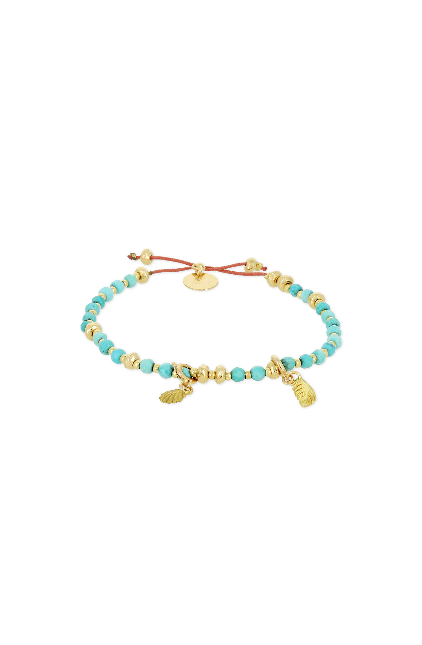 Adjustable bracelet set on a beige string. Gilded in gold brass and pewter based beads. Leaf and shell removable clasp charms. Gold plated metal. Made in France.