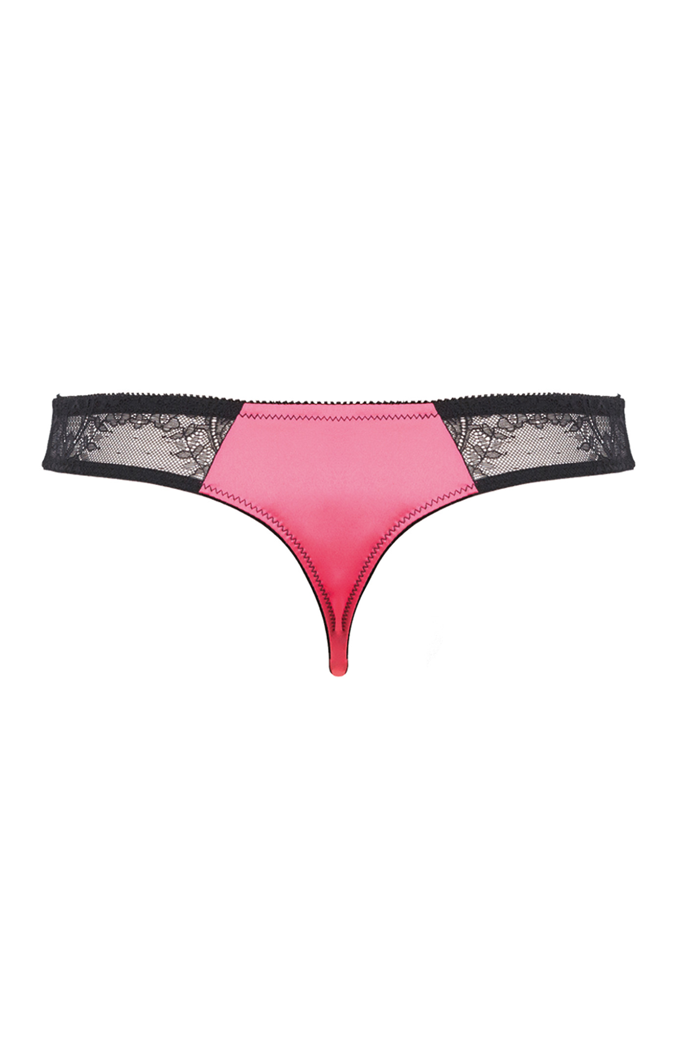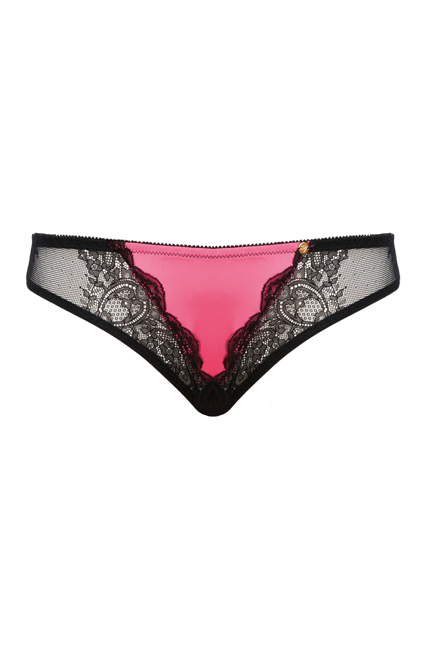 Stretch black lace and cherry blossom pink satin, golden medallion.