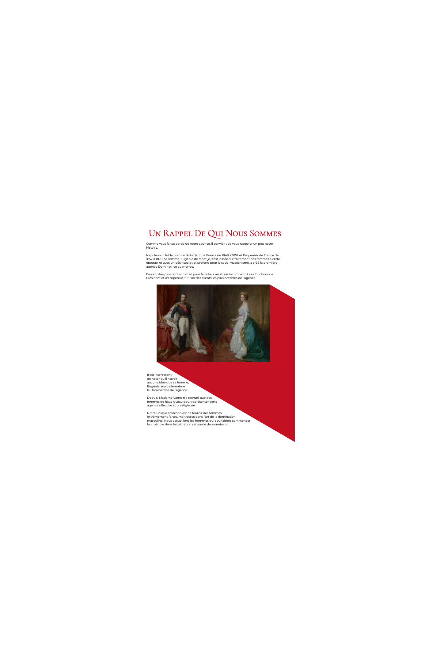 The rules are simple. You will receive emails which will help you organise three meetings between the client and the dominatrix. If you decide to meet once a week, the game will last a total of three weeks, but you can space it out as much as you like. Before each session, you will both receive a script to guide your actions, as well as a skills set document which contains all the knowledge you need for a successful evening.