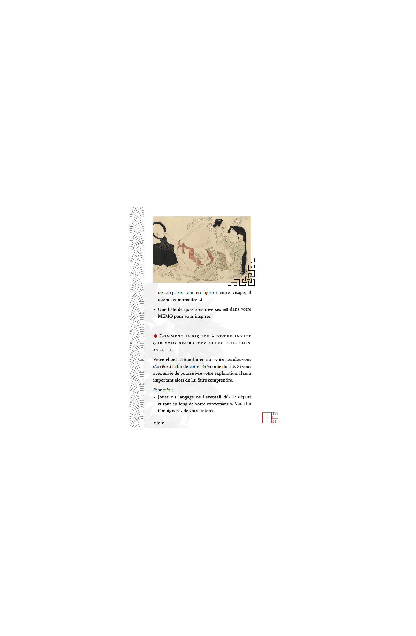 - Chaque rencontre est un rite de passage. Mr Ledru a le privilège d'accéder à une rencontre avec une Geisha. Il devra être à la hauteur pour qu'elle accèpte une prochaine rencontre avec lui. C'est donc une vraie parade amoureuse qui est proposée.