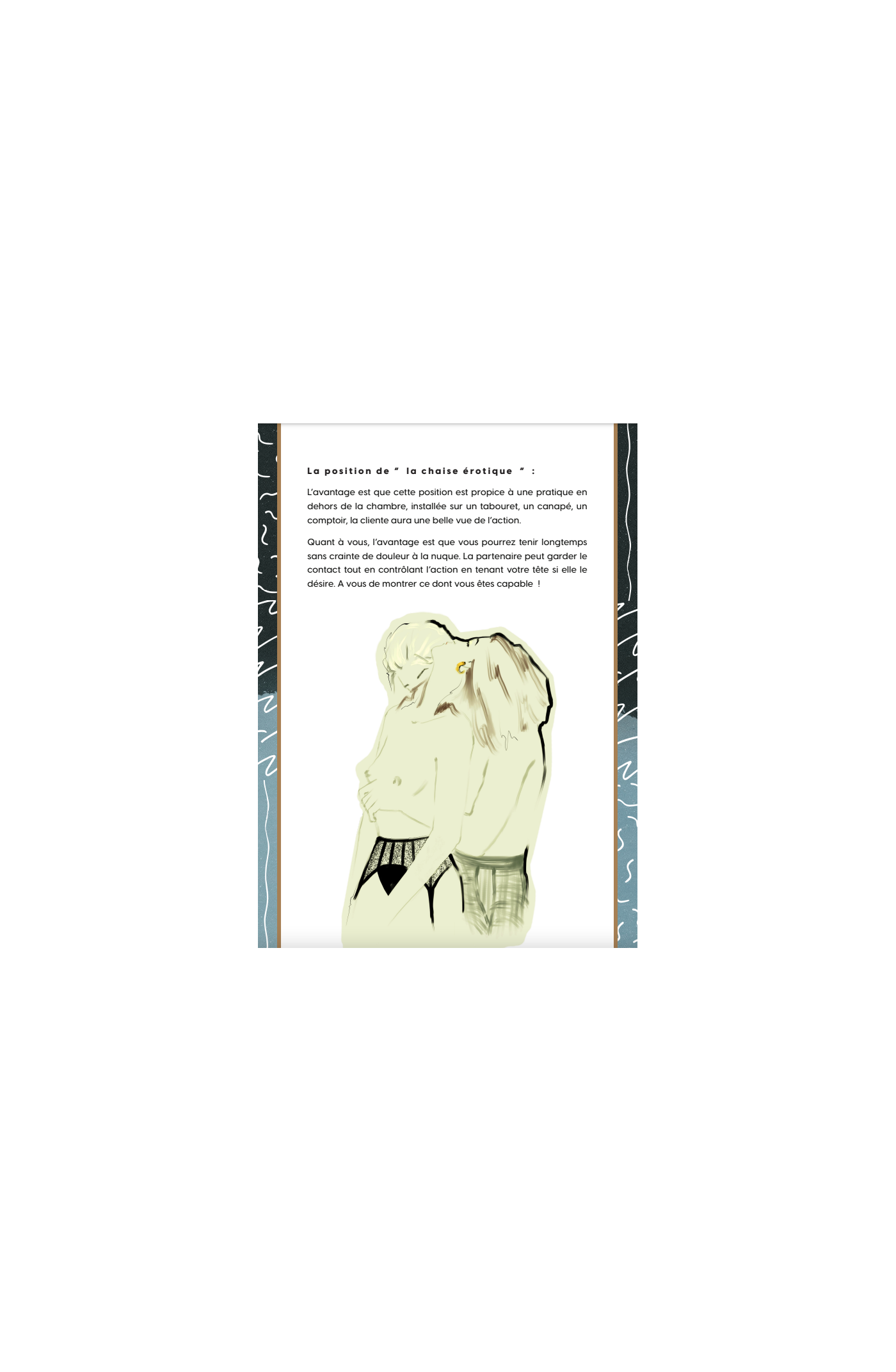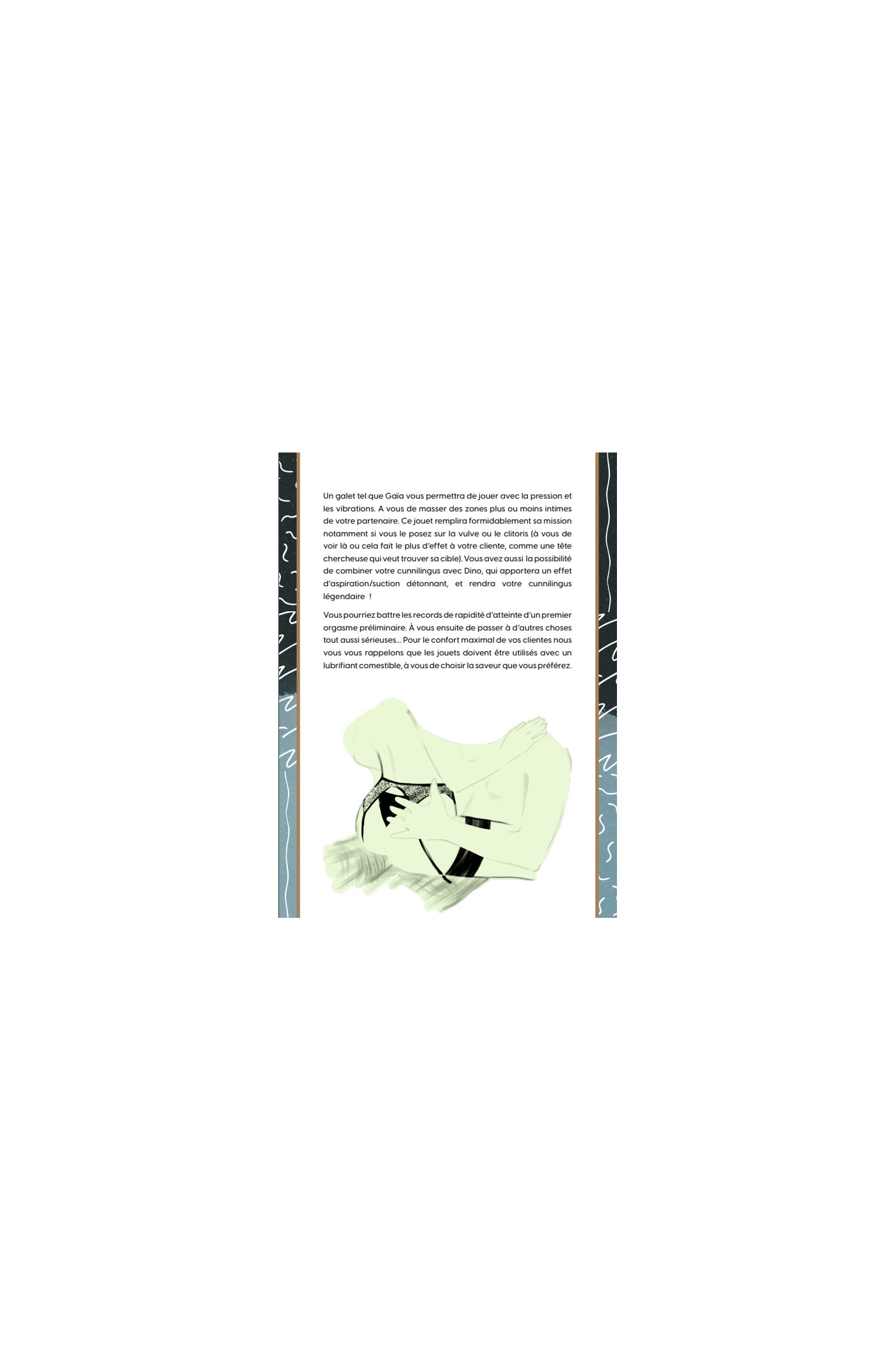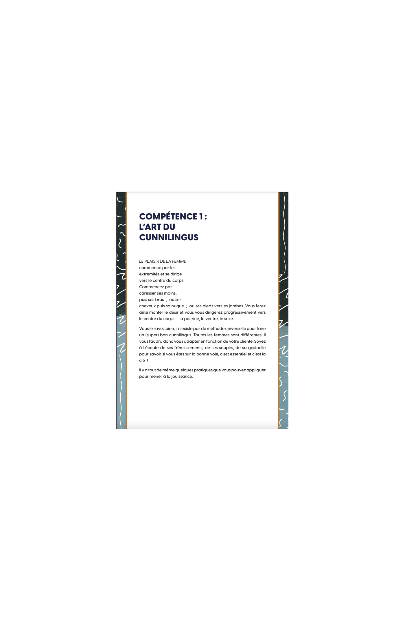 Lors de chaque séance, vous recevrez un scénario qui guidera vos actions et un document de compétences qui vous partagera les connaissances nécessaires pour profiter du jeu. Au-delà du jeu, ces compétences sont également pertinentes dans la vie sexuelle de tous les couples!