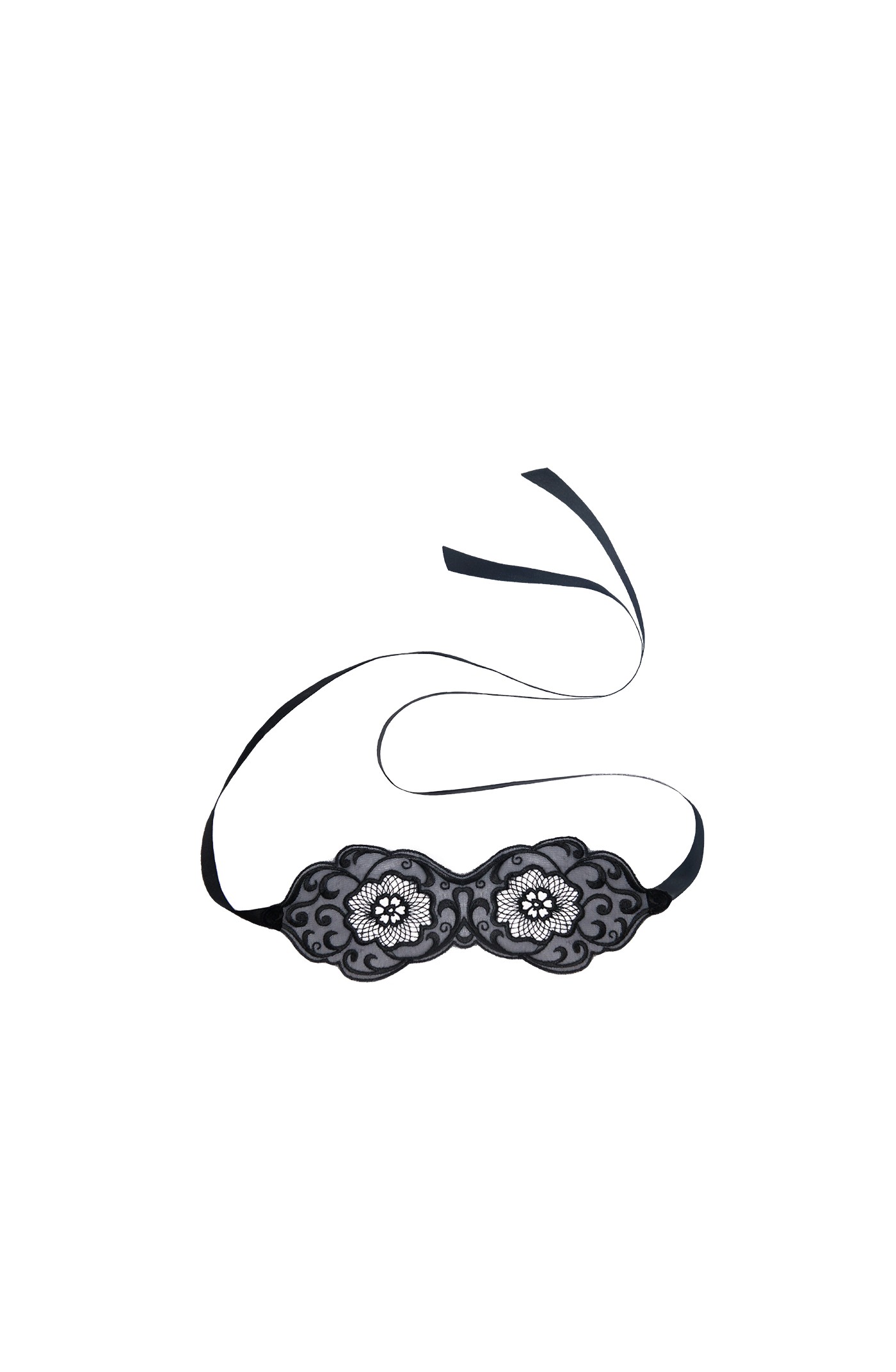 Black chiffon embroidered mask, equipped with two satin ribbons (0.5'' x 8.9'' each) and a golden medalllion. Dimensions: 7.9'' x 2.6'' Care instructions: hand wash separately in cold water. Do not tumble dry. Do not bleach.