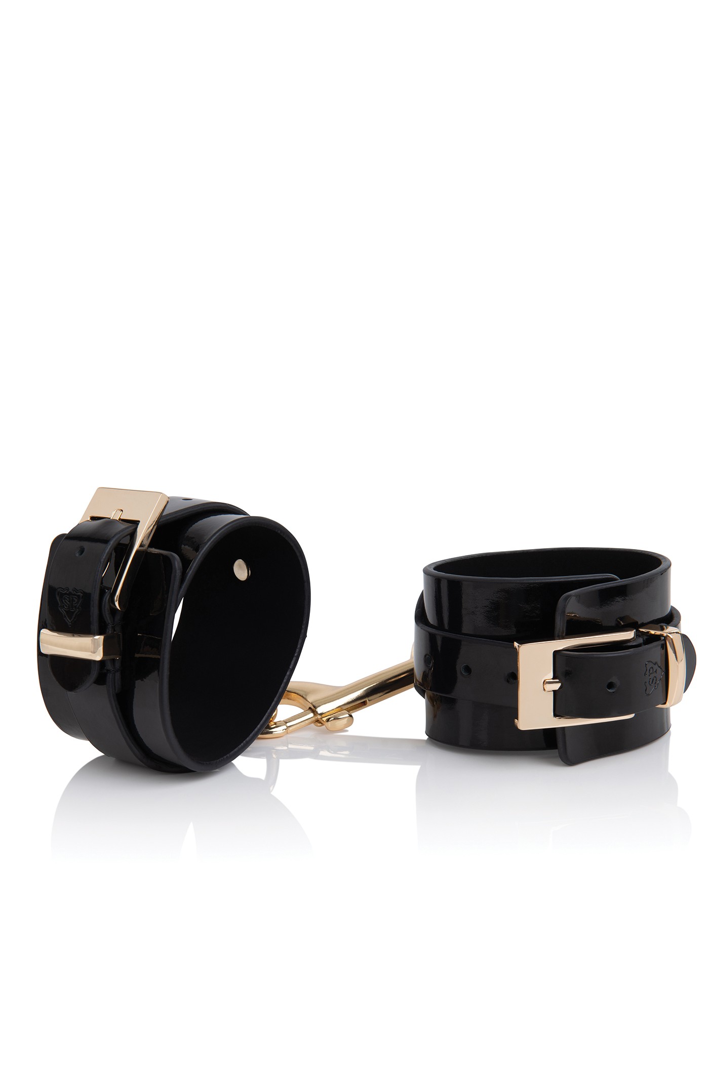 Handcuffs in black leather, varnish, flat nails, gold buckles and clasp. Adjustable. Dimensions: 5 cm (height handcuffs)
