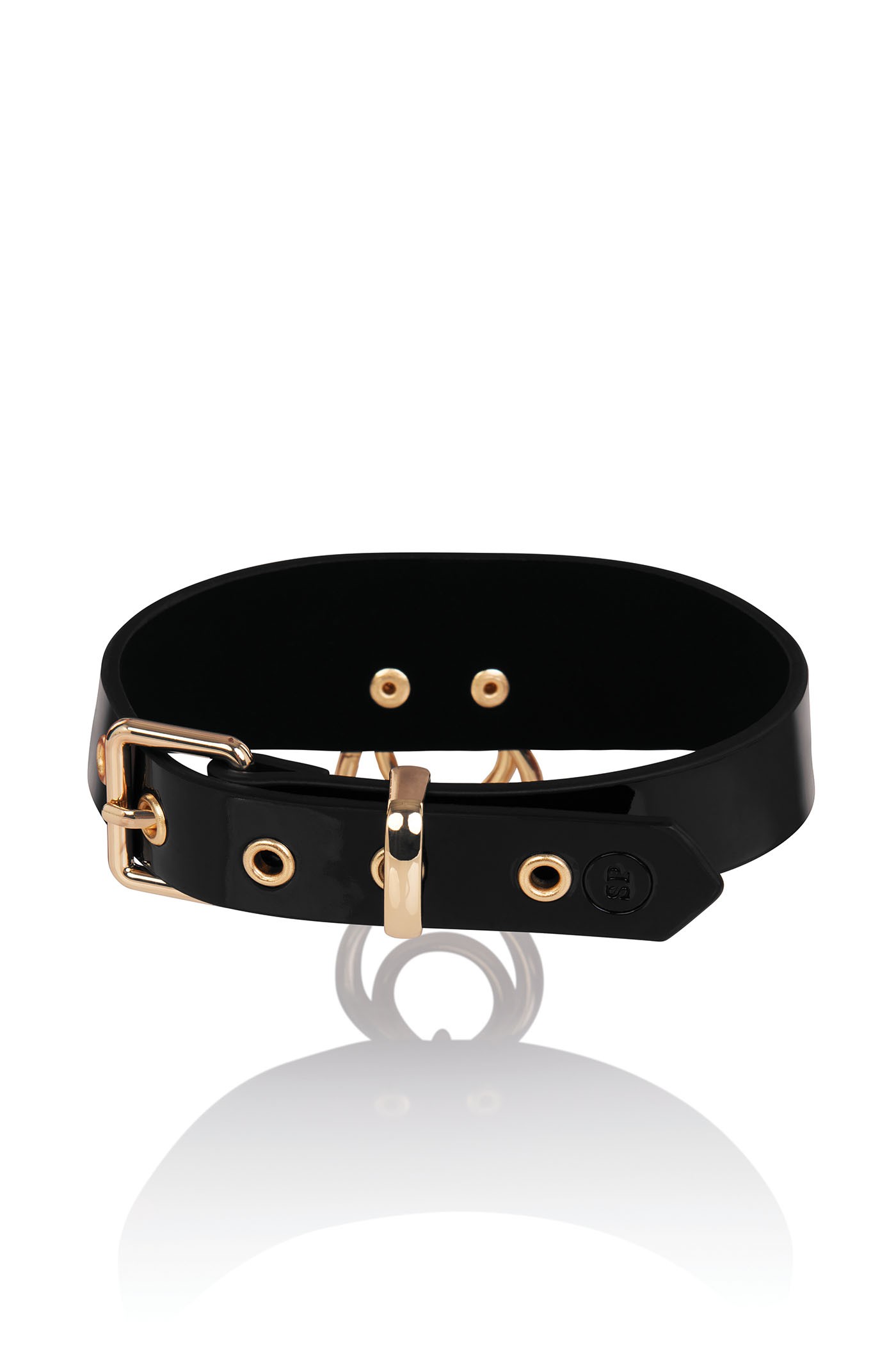 Collar in black patent leather. Golden details.