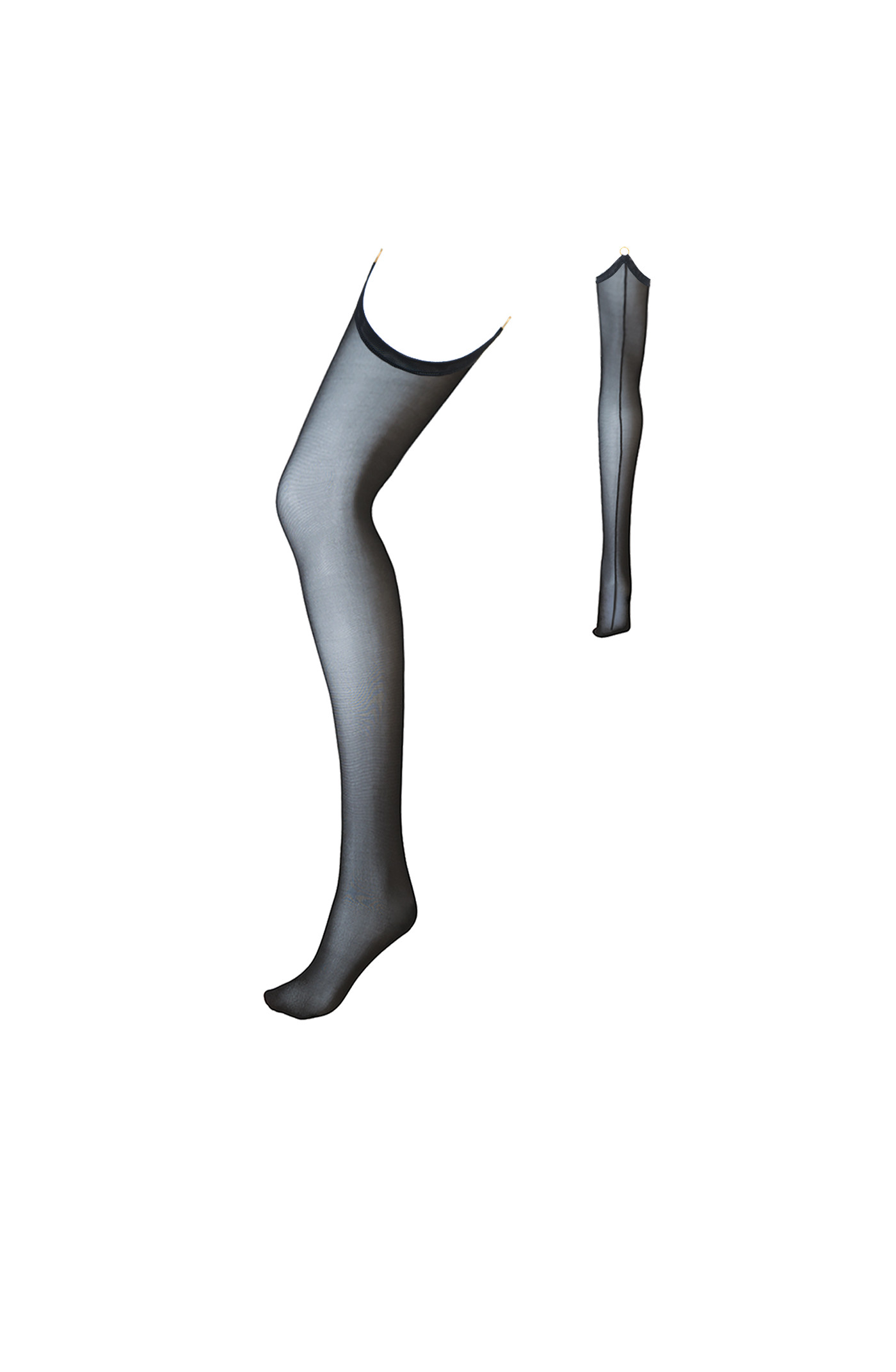 Materials: black stretch fabric, semi-sheer • Stockings: golden rings to attach the stockings to suspenders, black seam on the back. Care instructions: hand wash separately in cold water. Do not tumble dry. Do not bleach.