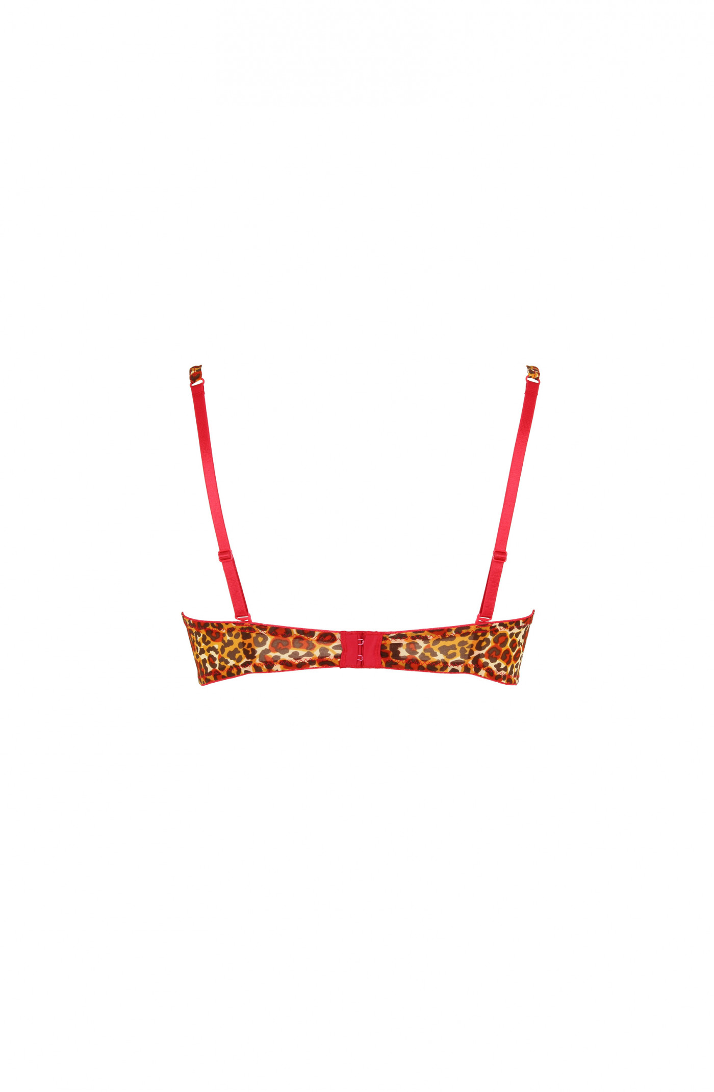 Soutien-gorge push-up à armatures avec coussins amovibles. Imprimé léopard, coutures rouge framboise. Noeud rouge au devant. Bretelles réglables. Anneaux et agrafes de réglages et de fermeture rouge framboise. Du 85A au 100E