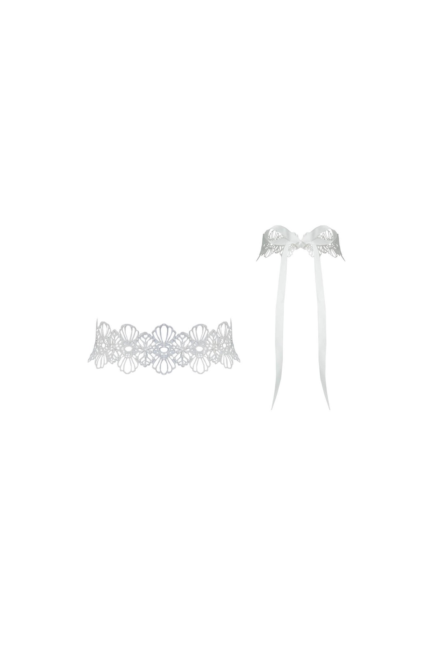 Choker ou jarretelle en dentelle fleurie blanche et noeud en satin blanc. Conseils d'entretien : Lavage à la main séparément à l'eau froide - Ne pas mettre au sèche-linge - Ne pas utiliser de javel