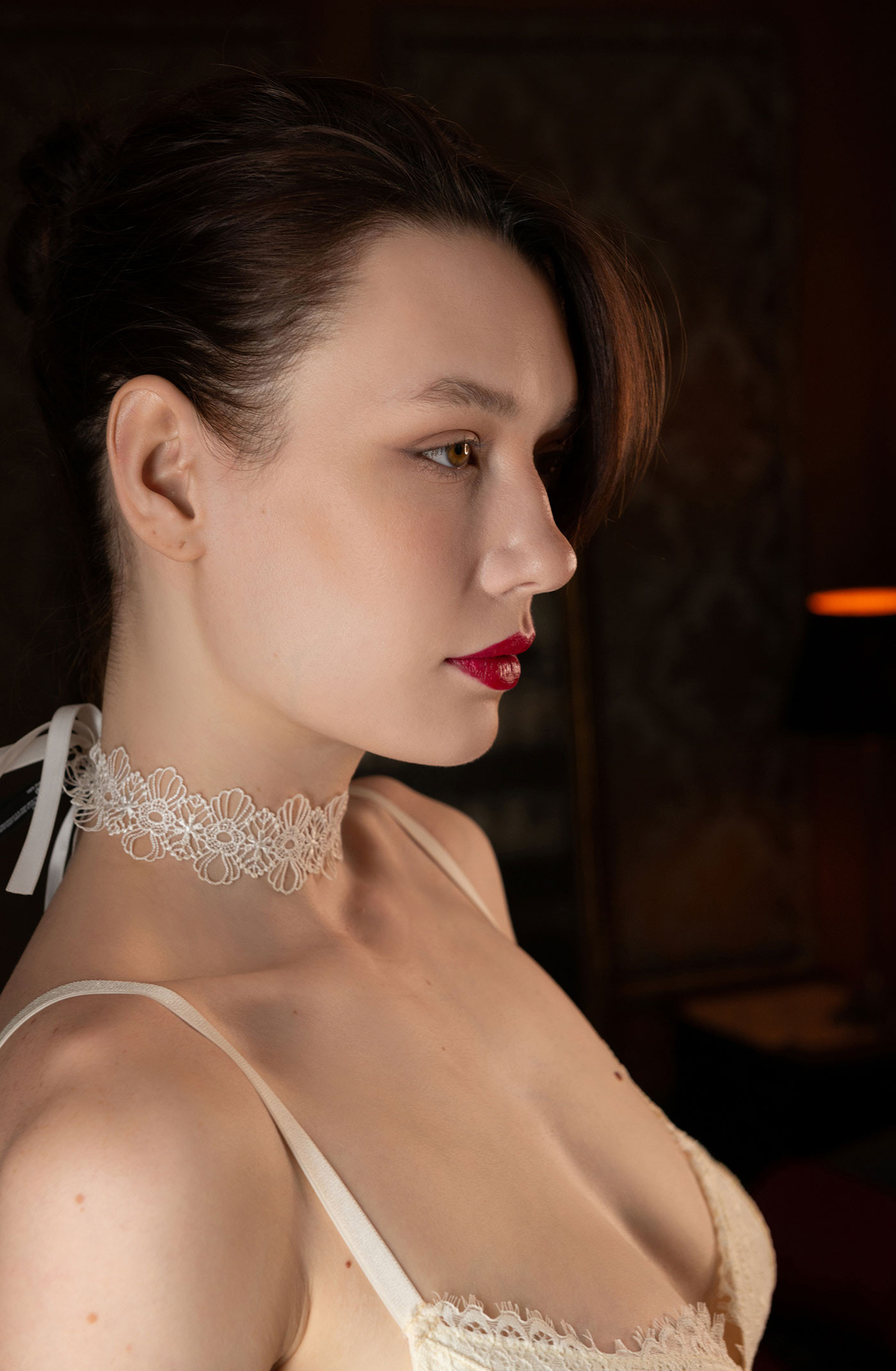 Cara est un joli choker délicat en dentelle fleurie blanche, se nouant avec un noeud en satin blanc.