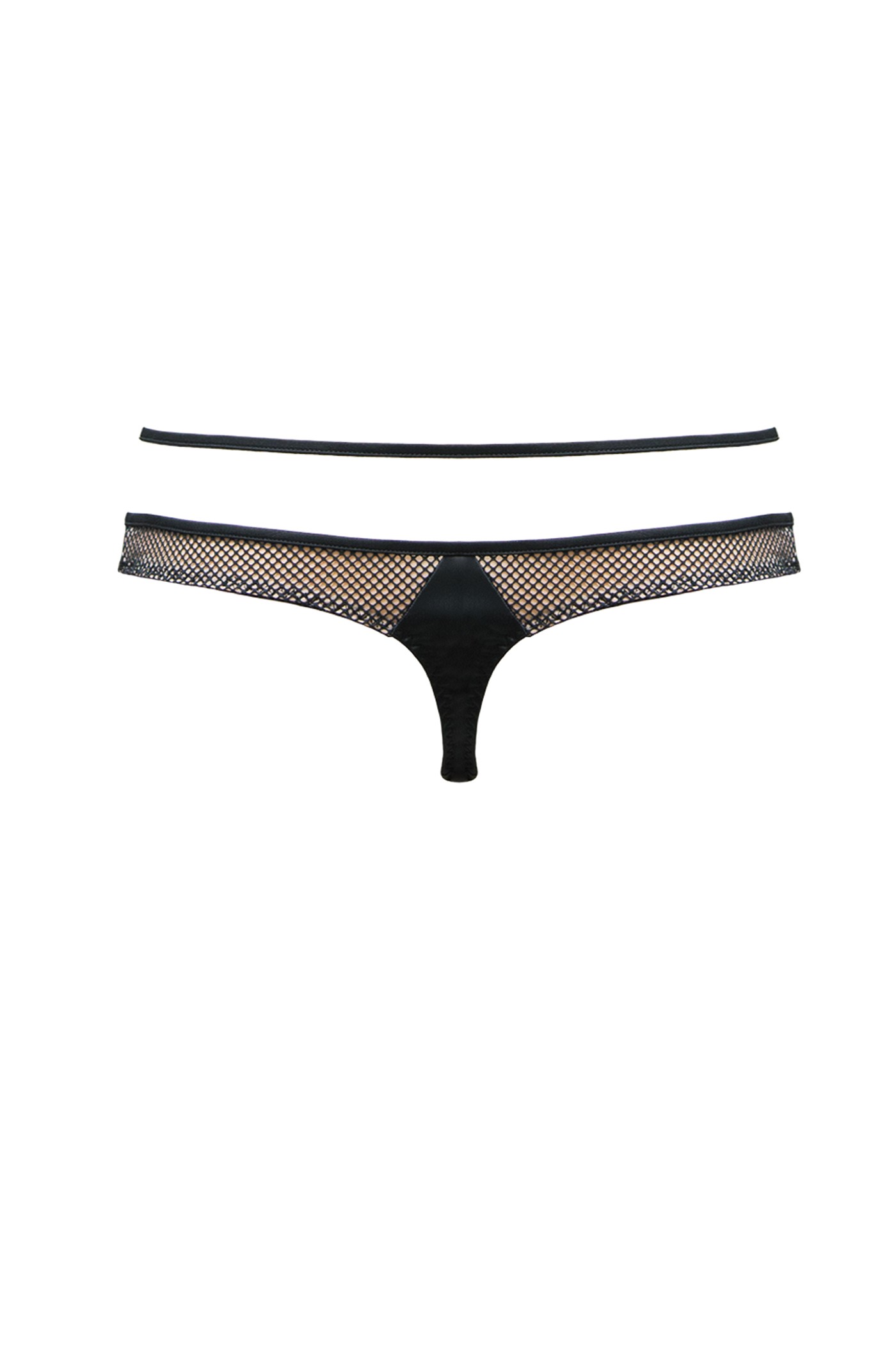 Matières : Satin et effet résille noir, mousseline nude. • Soutien-gorge ouvert : Armatures, bonnet découvert. • String : Ceinture élatique. Conseils d'entretien : Lavage à la main séparément à l'eau froide - Ne pas mettre au sèche-linge - Ne pas utiliser de javel Chaque pièce est venue séparément.