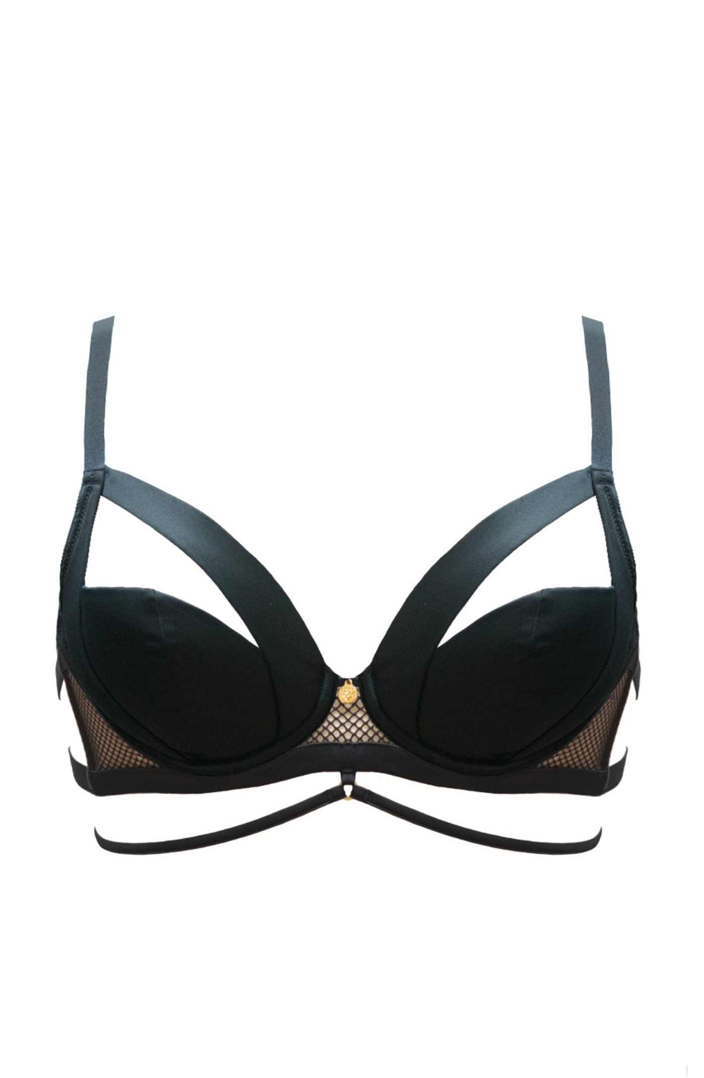 Matières : Satin et effet résille noir, mousseline nude. • Soutien-gorge : Armatures, rembourrage partiel, ouverture décorative sur le bonnet, bretelles ajustables. • Culotte : Ceinture élastique, ceinture additionnelle décorative ajustable et jarretelles détachables Conseils d'entretien : Lavage à la main séparément à l'eau froide - Ne pas mettre au sèche-linge - Ne pas utiliser de javel Chaque pièce est venue séparément.