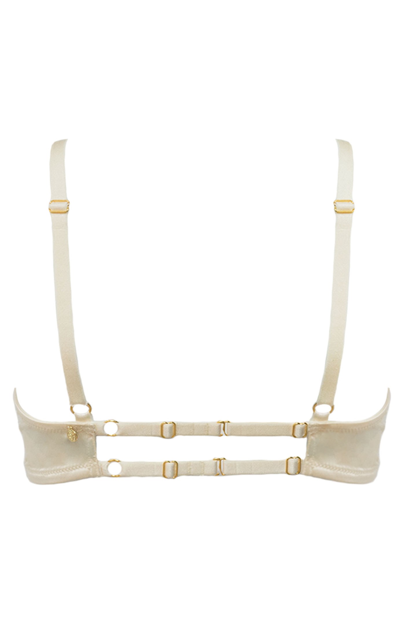 Materiali: pizzo, chiffon e raso color avorio, dettagli e medaglione dorati, nappine decorative. • Reggiseno: Con ferretto, coppe a mezza luna parzialmente imbottite, circonferenza regolabile. Dettagli plissettati lungo la circonferenza. • Culotte: Elastico in vita plissettato, dotato di due anelli centrali (uno sulla parte anteriore e uno sul retro). Due aperture laterali sul davanti e due sul retro. Istruzioni per il lavaggio: Lavare a mano separatamente in acqua fredda. Non mettere in asciugatrice, non candeggiare. Ogni pezzo è venduto separatamente.